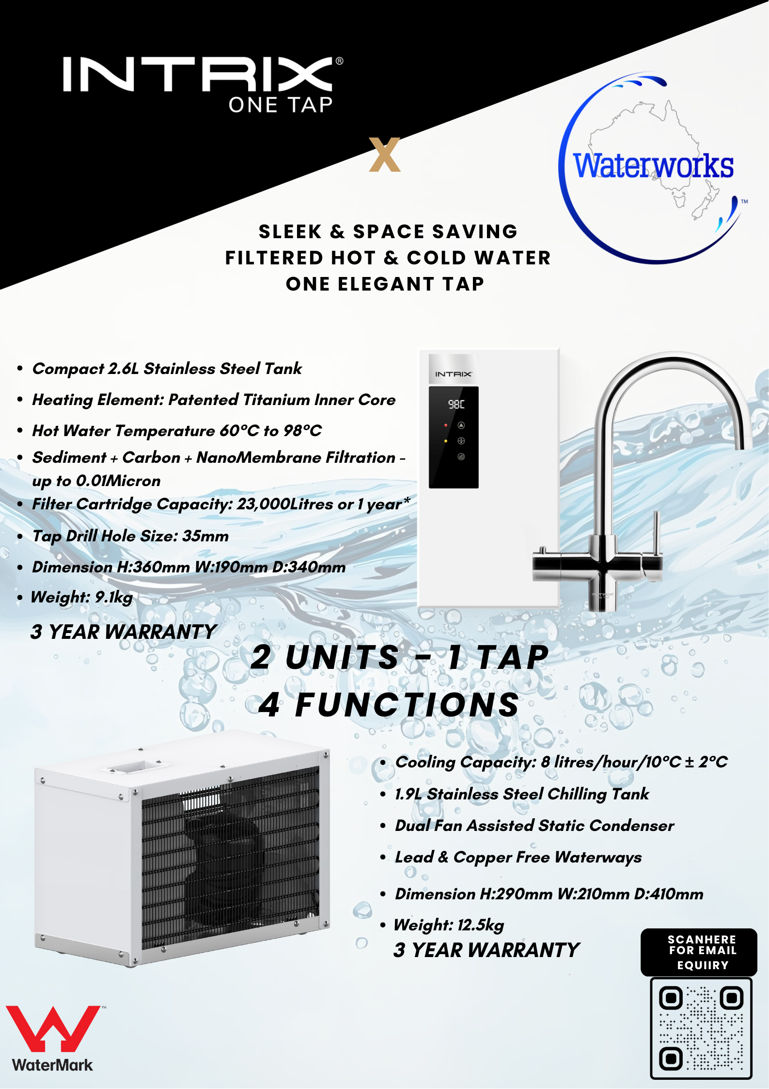 With its compact footprint, premium design, and powerful performance, the INTRIX ONE TAP × Waterworks 4-in-1 system is the smart choice for anyone wanting instant boiling and chilled water — without compromise.